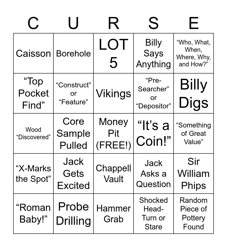 This bingo card has a free space and 99 words: Creamware, Knight’s Templar, Knights of Malta, LOT 5, LOT 26, Subtitles Used for Anyone, CGI Animation of Treasure Underground, Samuel Ball, Stone Well, Stone Road, Swamp, Nolan’s Cross, Sacred Geometry, Chappell Vault, Flashback to Another Country, Caisson, Borehole, Void, Garden Shaft, The Fellowship, Zena’s Map, H.O. Stone, Solution Channel, ROC Contracting, Drill Bucket, Sir William Phips, Vikings, Ground Penetrating Radar, The War Room, Anything Sniffed, Hammer Grab, Shocked Head-Turn or Stare, Either Lagina Adjusts Glasses to Look at Something, Member of the Fellowship Goes Underground, Core Sample Pulled, Wood “Discovered”, Road Trip Off the Island, Someone Gives a High-Five, Rick Gets Emotional, Jack Gets Excited, Jack Sifts, Billy Digs, Billy Says Anything, Probe Drilling, XRF Used, Square Nail Found, Button Found, Someone Tells a Bad Joke, Something Put in a Ziplock Bag, Camera Goes in a Borehole, Doug Wears Any NSCC Clothing, Random Piece of Pottery Found, Jack Asks a Question, Something Described as Old, Something Described as Medieval, Marty Wears Anything Fornetti, Carmen Legge Makes an Appearance, Guptill Carries GPS, Found Symbol Linked to Templars, Alex Explains What They’re Doing, Video Call, Carbon Dating, Equipment Breaks, “Archaeo-metallurgist”, “230-year-old Mystery”, “Who, What, When, Where, Why, and How?”, “Metal Detection Expert Gary Drayton”, “Eyes and Boots”, “The One Thing”, “X-Marks the Spot”, “Bravo Tango”, “Pre-Searcher” or “Depositor”, “Top Pocket Find”, “In Situ”, “Carry On” or “Get to Work”, “inge” or “ook”, “Construct” or “Feature”, “Bag and Tag”, “AHA” Moment”, “Siempre Avanti”, “It’s a Coin!”, “Call Rick” or “Call Marty”, “Could it Be?”, “Wow”, “High Trace Evidence”, “Off-Set Chamber”, “Vault-like Structure”, “Is it Possible?”, “Something of Great Value”, “Roman Baby!”, “C’mon Be Something Good!”, Flood Tunnel, “Bobby Dazzler”, Concepción, Vault, Eye of the Swamp, SONAR, Smith’s Cove and Lead Cross.