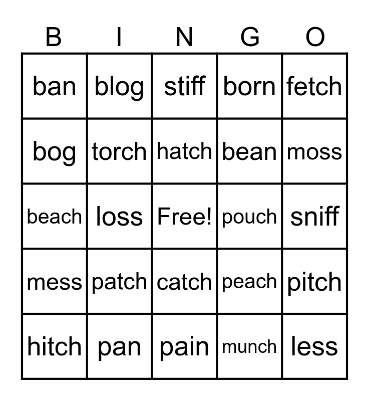 This bingo card has a free space and 24 words: patch, pan, hatch, hitch, fetch, ban, bog, blog, pouch, catch, bean, beach, peach, pitch, torch, munch, sniff, stiff, moss, loss, less, mess, born and pain.