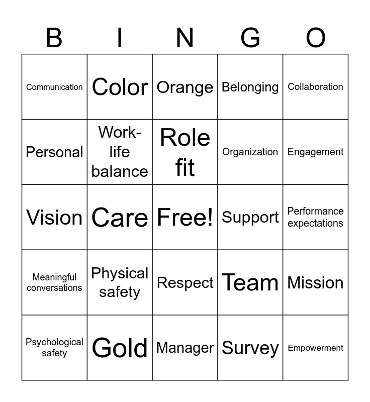 This bingo card has a free space and 39 words: Follow-up, Accountability, Recognition, Work-life balance, Psychological safety, Respect, Role fit, Career growth, Collaboration, Meaningful conversations, Care, Belonging, Empowerment, Performance expectations, Support, Physical safety, Resources, Communication, Trust, Team, Personal, Manager, Organization, Engagement, Personal Accomplishment, Intent to Stay, Motivate, Recommend, Fun, Color, Blue, Green, Orange, Gold, Survey, ICARE, Mission, Vision and Plan.