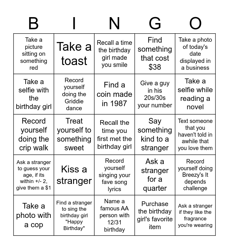 This bingo card has a free space and 24 words: Kiss a stranger, Find a stranger to sing the birthday girl "Happy Birthday", Find a coin made in 1987, Take a photo with a cop, Take a photo of today's date displayed in a business, Take a picture sitting on something red, Take a selfie with the birthday girl, Take a toast, Say something kind to a stranger, Record yourself singing your fave song lyrics, Give a guy in his 20s/30s your number, Record yourself doing the crip walk, Ask a stranger for a quarter, Record yourself doing Breezy's It depends challenge, Record yourself doing the Griddie dance, Purchase the birthday girl's favorite item, Text someone that you haven't told in awhile that you love them, Recall a time the birthday girl made you smile, Take a selfie while reading a novel, Treat yourself to something sweet, Ask a stranger if they like the fragrance you're wearing, Ask a stranger to guess your age, if its within +/- 2, give them a $1, Find something that cost $38 and Name a famous AA person with 12/31 birthday.