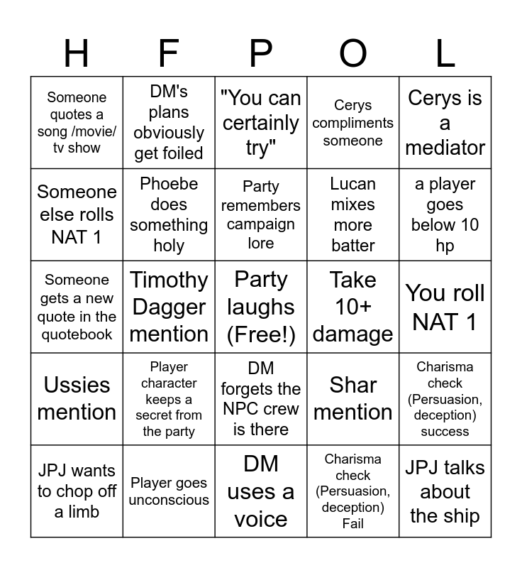 This bingo card has a free space and 34 words: You roll NAT 20, Charisma check (Persuasion, deception) Fail, Party plans for a really long time, Unprepared NPC name, Ussies mention, Phoebe does something holy, Cerys is a mediator, JPJ wants to chop off a limb, DM's plans obviously get foiled, Zelphira makes fun of JPJ, Party remembers campaign lore, "You can certainly try", DM Rolls dice randomly?, Party finds creative solution to an issue, Take 10+ damage, a player goes below 10 hp, Player goes unconscious, Someone gets a new quote in the quotebook, Player character keeps a secret from the party, Shar mention, DM forgets the NPC crew is there, Loot a dead body, Someone quotes a song /movie/ tv show, You roll NAT 1, DM uses a voice, JPJ talks about the ship, Cerys compliments someone, Zelphira uses the magic 8 ball, Lucan mixes more batter, Someone else rolls NAT 1, Someone else rolls NAT 20, Timothy Dagger mention, Charisma check (Persuasion, deception) success and Stealth check fail.