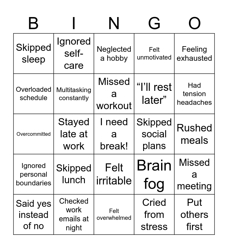 This bingo card has a free space and 24 words: Skipped lunch, Checked work emails at night, Missed a workout, Said yes instead of no, Feeling exhausted, Skipped sleep, Overloaded schedule, Ignored self-care, Skipped social plans, Felt irritable, “I’ll rest later”, Overcommitted, Brain fog, Missed a meeting, Multitasking constantly, Cried from stress, Rushed meals, Neglected a hobby, Had tension headaches, Stayed late at work, Put others first, Ignored personal boundaries, Felt unmotivated and Felt overwhelmed.