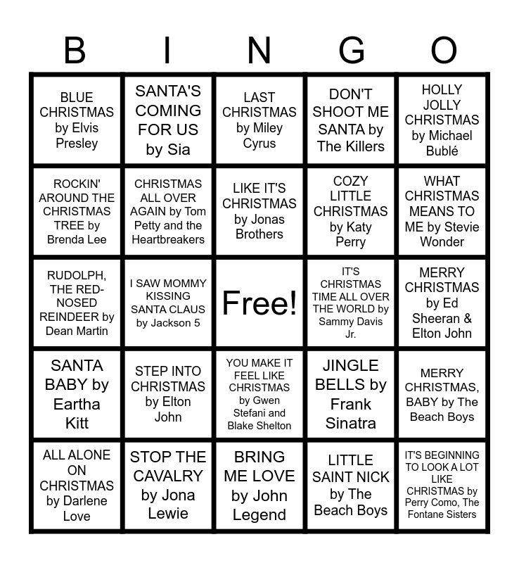 This bingo card has a free space and 55 words: A MARSHMALLOW WORLD by Dean Martin, ALL ALONE ON CHRISTMAS by Darlene Love, ALL I WANT FOR CHRISTMAS IS YOU by Mariah Carey & Justin Bieber, BLUE CHRISTMAS by Elvis Presley, BRING ME LOVE by John Legend, CHRISTMAS (BABY, PLEASE COME HOME) by U2, CHRISTMAS ALL OVER AGAIN by Tom Petty and the Heartbreakers, CHRISTMAS TREE FARM by Taylor Swift, COZY LITTLE CHRISTMAS by Katy Perry, DECK THE HALLS by Nat King Cole, DON'T SHOOT ME SANTA by The Killers, FAIRYTALE OF NEW YORK by The Pogues, FELIZ NAVIDAD by Jose Feliciano, FROSTY THE SNOWMAN by Ella Fitzgerald, GRANDMA GOT RUN OVER BY A REINDEER by Elmo & Patsy, HAVE YOURSELF A MERRY LITTLE CHRISTMAS by Frank Sinatra, HOLLY JOLLY CHRISTMAS by Michael Bublé, I SAW MOMMY KISSING SANTA CLAUS by Jackson 5, IT WAS THE MOST WONDERFUL TIME OF THE YEAR by Andy Williams, IT'S BEGINNING TO LOOK A LOT LIKE CHRISTMAS by Perry Como, The Fontane Sisters, IT'S CHRISTMAS TIME ALL OVER THE WORLD by Sammy Davis Jr., JINGLE BELL ROCK by Bobby Helms, JINGLE BELLS by Frank Sinatra, LAST CHRISTMAS by Miley Cyrus, LET IT SNOW! LET IT SNOW! LET IT SNOW! by Dean Martin, LIKE IT'S CHRISTMAS by Jonas Brothers, LITTLE SAINT NICK by The Beach Boys, MAKE IT TO CHRISTMAS by Alessia Cara, MERRY CHRISTMAS by Ed Sheeran & Elton John, MERRY CHRISTMAS, BABY by The Beach Boys, MERRY XMAS EVERYBODY by Slade, MISTLETOE by Justin Bieber, MUST BE SANTA by Bob Dylan, PLEASE COME HOME FOR CHRISTMAS by Eagles, ROCKIN' AROUND THE CHRISTMAS TREE by Brenda Lee, RUDOLPH, THE RED-NOSED REINDEER by Dean Martin, RUN RUDOLPH RUN by Chuck Berry, SANTA BABY by Eartha Kitt, SANTA CLAUS IS COMING TO TOWN by Jackson 5, SANTA TELL ME by Ariana Grande, SANTA'S COMING FOR US by Sia, SLEIGH RIDE by The Ronettes, SNOOPY'S CHRISTMAS by Snoopy's Christmas, SOME DAY AT CHRISTMAS by Stevie Wonder, STEP INTO CHRISTMAS by Elton John, STOP THE CAVALRY by Jona Lewie, THANK GOD IT'S CHRISTMAS by Queen, THE CHRISTMAS SONG by Nat King Cole, UNDERNEATH THE TREE by Kelly Clarkson, WHAT CHRISTMAS MEANS TO ME by Stevie Wonder, WHITE CHRISTMAS by Bing Crosby, WINTER WONDERLAND by Dean Martin, WONDERFUL CHRISTMASTIME by Paul McCartney, YOU MAKE IT FEEL LIKE CHRISTMAS by Gwen Stefani and Blake Shelton and YOU'RE A MEAN ONE, MR. GRINCH by Tyler The Creator.