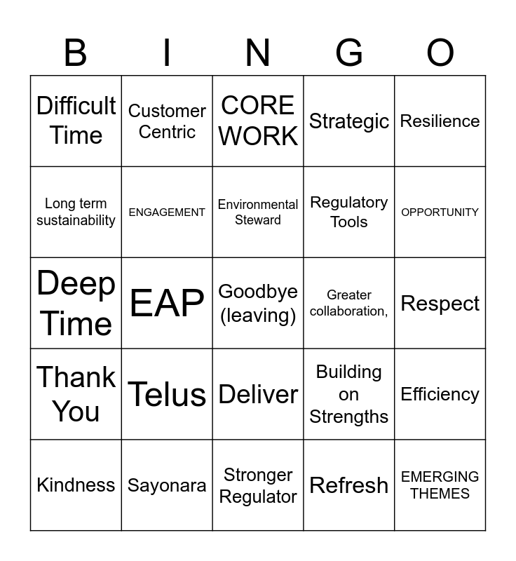 This bingo card has 25 words: Telus, Stronger Regulator, Environmental Steward, Kindness, Resilience, Difficult Time, Long term sustainability, Customer Centric, Greater collaboration,, Deliver, Regulatory Tools, Deep Time, Building on Strengths, Efficiency, ENGAGEMENT, EMERGING THEMES, Respect, CORE WORK, OPPORTUNITY, EAP, Goodbye (leaving), Sayonara, Thank You, Strategic and Refresh.