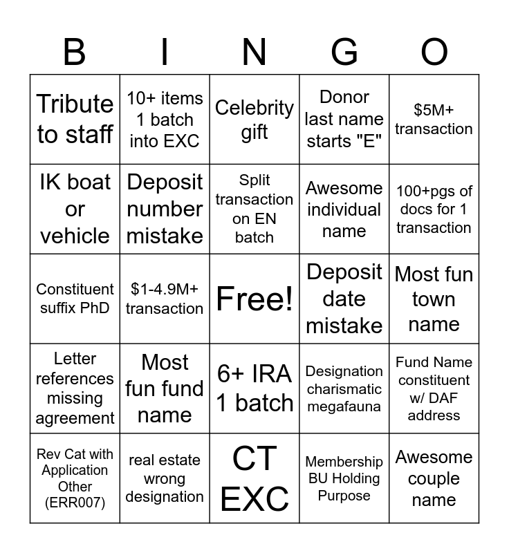 This bingo card has a free space and 82 words: Final payment on ITG, 2+ pages in batch, Celebrity gift, 20+ EXC status in q, Canada batch =>$7,000CAD, 2+ tributes on 1 line, Credit card lease payment, Row message!, PAC Match, Fidelity wrong constituent, EXC4, H100055 should be BU Holding, Deposit number mistake, Deposit date mistake, Seasonal check image or card, Tribute to staff, Rev Cat with Application Other (ERR007), IK boat or vehicle, Gift into escrow, Carbon offset/retirement, Unallowable PP, Awesome individual name, Awesome couple name, $5M+ transaction, $1-4.9M+ transaction, $500k-999k transaction, Mbrshp designation incorrectly changed, In-Kind Rev Cat 400200, Gift all 3 private award types, Lobbying (do not ack), Most fun fund name, Gift from staff, Constituent suffix PhD, Constituent church or govt official, shortest straw or max weirdness, CT EXC, Batch total <$5, Fund name with animals, 100+pgs of docs for 1 transaction, Oak leaf logo on remit device, Donor first name starts "V", Donor last name starts "E", Books missing, Undesignated DAF 400300, Docs way out of order, 10+ items 1 batch into EXC, Typo in formal proposal, Split transaction on EN batch, 12+ batch items no EXC, UCPP, No proof of deposit, Most fun town name, real estate wrong designation, EXC returned no change or comment, Solicitor credit, DAF within a DAF ex. Pittsburgh Foundation, ITG pmt no ITG docs, Recoverable grant, D.V.M. after name (vet), Designation charismatic megafauna, Handwritten child's note, Gift from school/class, Letter references missing agreement, $100k+ gift no agreement, Pay Per Action transaction, Event sponsorship, copy/photo of cash, 20 procedure clips in EXC in 1 day, No DAF letter/details, Unmanaged WO donation, Contractual revenue entered as donation, India batch has projected #, 6+ IRA 1 batch, Membership BU Holding Purpose, Many blank docs pages, Direct debit-online, Creator used wrong GL Period, Same day deposit and commit, Projected # zero, FCW batch 2+ gifts, Fund Name constituent w/ DAF address and Wire payment method IRA.