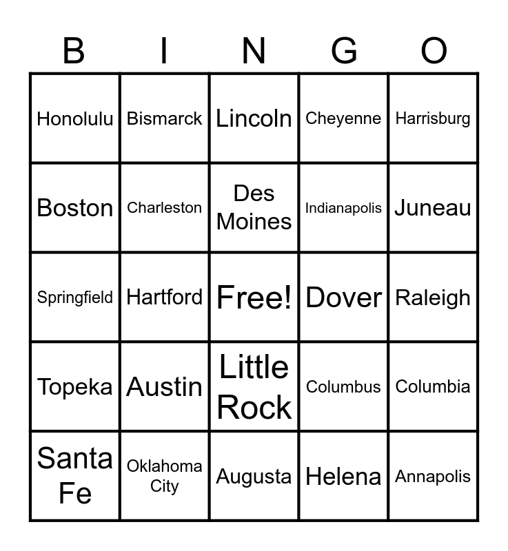 This bingo card has a free space and 50 words: Albany, Annapolis, Atlanta, Augusta, Austin, Baton Rouge, Bismarck, Boise, Boston, Carson City, Charleston, Cheyenne, Columbia, Columbus, Concord, Denver, Des Moines, Dover, Frankfort, Harrisburg, Hartford, Helena, Honolulu, Indianapolis, Jackson, Jefferson City, Juneau, Lansing, Lincoln, Little Rock, Madison, Montgomery, Montpelier, Nashville, Oklahoma City, Olympia, Phoenix, Pierre, Providence, Raleigh, Richmond, Sacramento, Salem, Salt Lake City, Santa Fe, Springfield, St. Paul, Tallahassee, Topeka and Trenton.