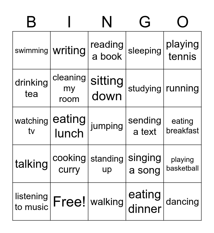 This bingo card has 28 words: playing basketball, playing soccer, studying, eating dinner, drinking tea, reading a book, writing, talking, sending a text, listening to music, watching tv, sleeping, Free!, walking, running, jogging, cooking curry, cleaning my room, sitting down, standing up, swimming, dancing, jumping, eating lunch, eating breakfast, singing a song, playing tennis and drawing a picture.