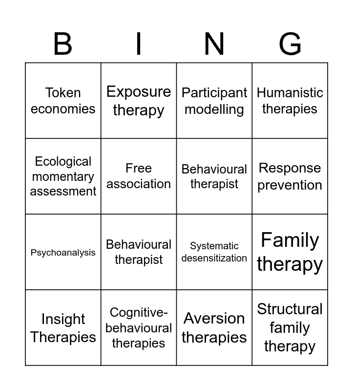 This bingo card has 33 words: Gestalt therapy, Group therapy, Family therapy, Strategic family interventions, Structural family therapy, Behavioural therapist, Ecological momentary assessment, Systematic desensitization, Exposure therapy, Dismantling, Response prevention, Participant modelling, Token economies, Aversion therapies, Cognitive-behavioural therapies, Behavioural therapist, Ecological momentary assessment, Systematic desensitization, Exposure therapy, Dismantling, Response prevention, Participant modelling, Token economies, Aversion therapies, Cognitive-behavioural therapies, Insight Therapies, Humanistic therapies, Psychoanalysis, Free association, Interpretation, Dream Analysis, Resistance and Transference.