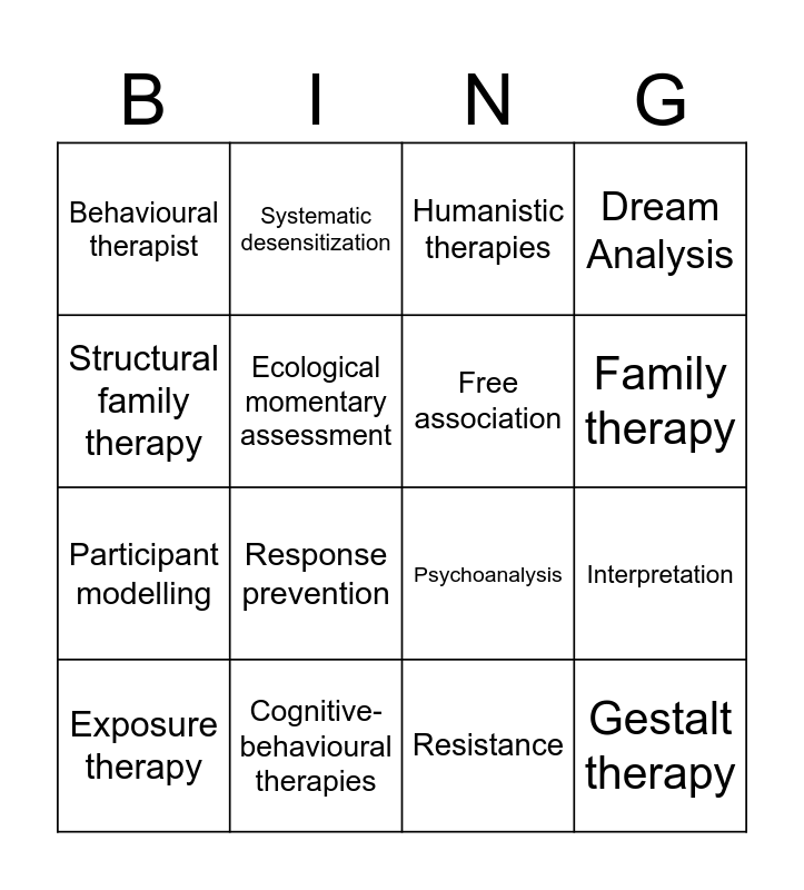 This bingo card has 23 words: Gestalt therapy, Group therapy, Family therapy, Strategic family interventions, Structural family therapy, Behavioural therapist, Ecological momentary assessment, Systematic desensitization, Exposure therapy, Dismantling, Response prevention, Participant modelling, Token economies, Aversion therapies, Cognitive-behavioural therapies, Insight Therapies, Humanistic therapies, Psychoanalysis, Free association, Interpretation, Dream Analysis, Resistance and Transference.