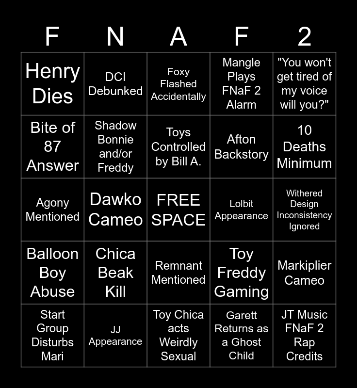 This bingo card has a free space and 24 words: Chica Beak Kill, JJ Appearance, Toys Controlled by Bill A., Start Group Disturbs Mari, "You won't get tired of my voice will you?", Henry Dies, Bite of 87 Answer, DCI Debunked, Lolbit Appearance, Remnant Mentioned, Afton Backstory, Agony Mentioned, Toy Freddy Gaming, Markiplier Cameo, Shadow Bonnie and/or Freddy, Garett Returns as a Ghost Child, Withered Design Inconsistency Ignored, Foxy Flashed Accidentally, 10 Deaths Minimum, Dawko Cameo, JT Music FNaF 2 Rap Credits, Balloon Boy Abuse, Mangle Plays FNaF 2 Alarm and Toy Chica acts Weirdly Sexual.