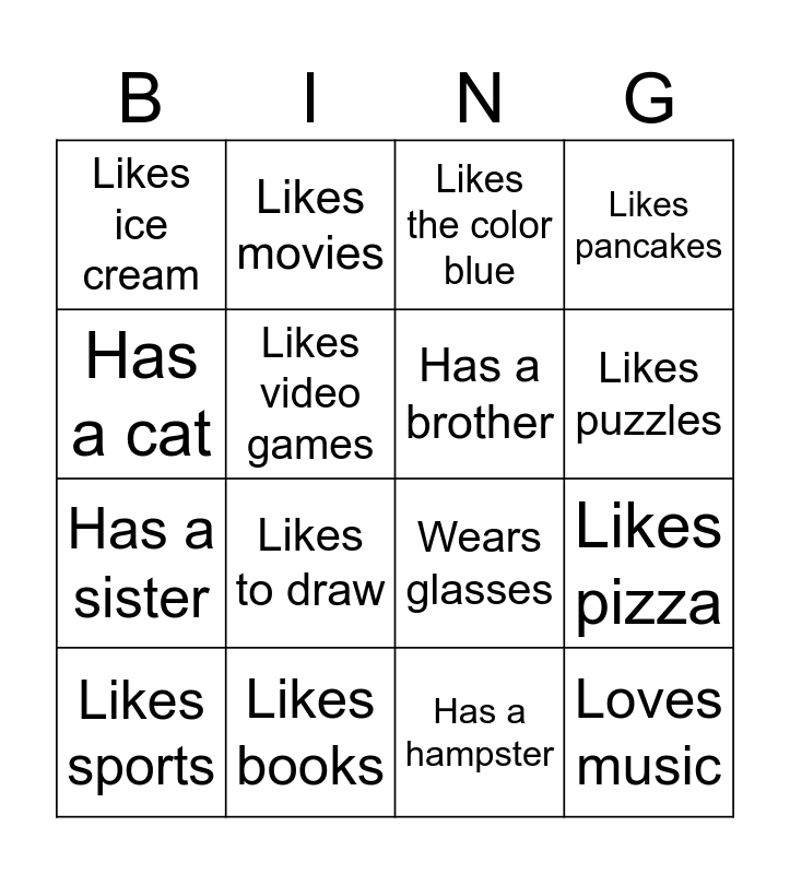 This bingo card has 20 words: Likes pizza, Has a dog, Likes the color blue, Loves animals, Likes sports, Has a cat, Likes books, Likes ice cream, Has a sister, Likes movies, Likes to draw, Wears glasses, Likes video games, Loves music, Has a brother, Likes the playground, Likes puzzles, Likes pancakes, Has a hampster and Likes snow.