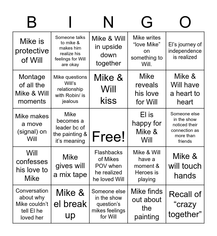 This bingo card has a free space and 24 words: Mike gives will a mix tape, Mike & el break up, Mike & Will kiss, Conversation about why Mike couldn’t tell El he loved her, El’s journey of independence is realized, Mike is protective of Will, Montage of all the Mike & Will moments, Someone talks to mike & makes him realize his feelings for Will are okay, El is happy for Mike & Will, Flashbacks of Mikes POV when he realized he loved Will, Mike reveals his love for Will, Mike makes a move (signal) on Will, Mike & Will have a moment & Heroes is playing, Mike & will touch hands, Mike questions Will’s relationship with Robin/ is jealous, Mike finds out about the painting, Someone else in the show noticed their connection as more than friends, Mike & Will in upside down together, Mike & Will have a heart to heart, Mike becomes a leader bc of the painting & it’s meaning, Recall of “crazy together”, Will confesses his love to Mike, Mike writes “love Mike” on something to Will. and Someone else in the show question’s mikes feelings for Will.