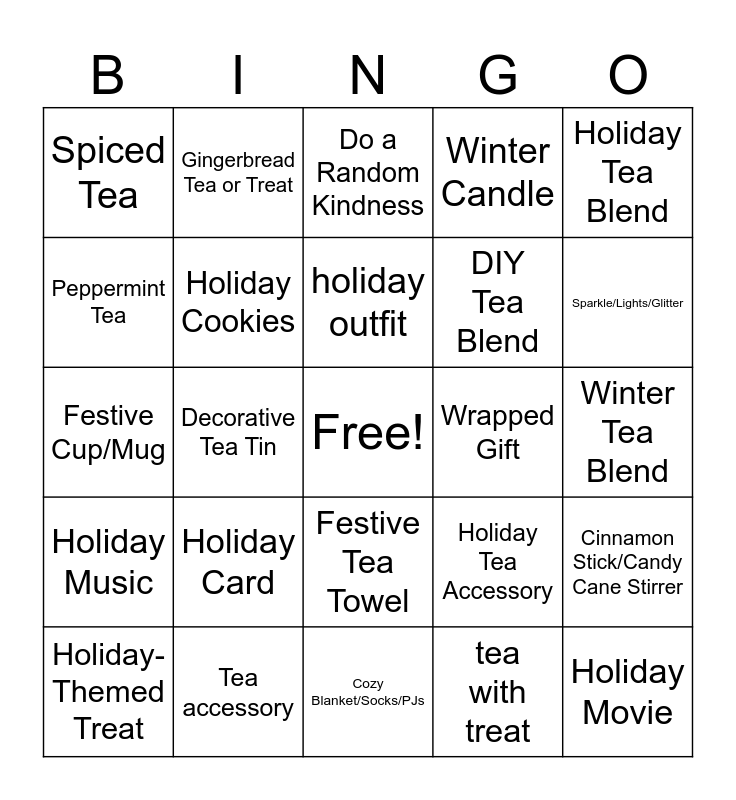 This bingo card has a free space and 26 words: Festive Tea Towel, tea with treat, holiday outfit, Tea accessory, Holiday Tea Blend, Spiced Tea, Peppermint Tea, Gingerbread Tea or Treat, Winter Tea Blend, Holiday Tea Accessory, DIY Tea Blend, Festive Cup/Mug, Cinnamon Stick/Candy Cane Stirrer, Holiday-Themed Treat, Decorative Tea Tin, Holiday Ornament, Winter Candle, Holiday Music, Do a Random Kindness, Holiday Movie, Sparkle/Lights/Glitter, Cozy Blanket/Socks/PJs, Wrapped Gift, Holiday Card, Holiday Cookies and Self Care.