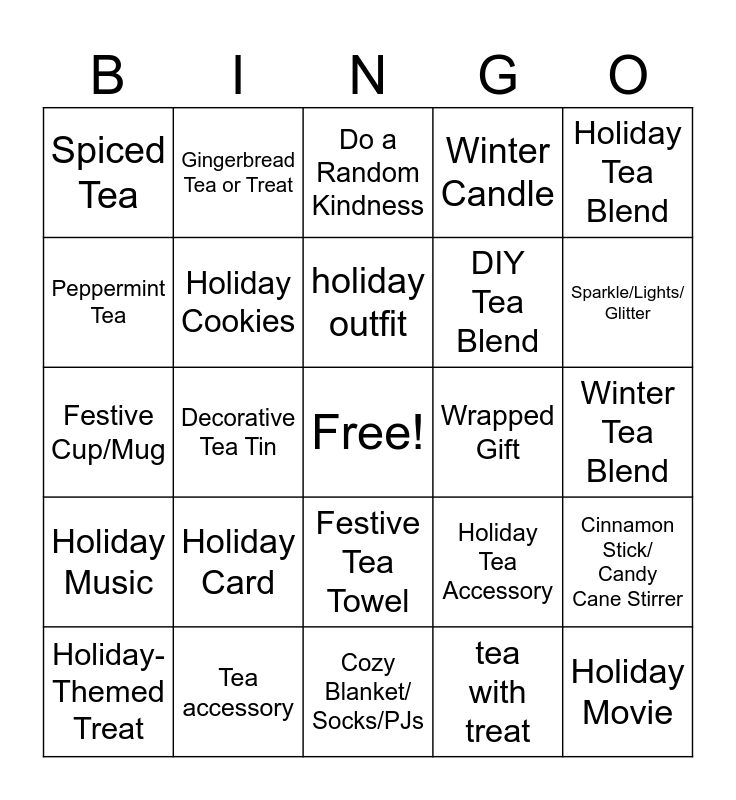 This bingo card has a free space and 26 words: Festive Tea Towel, tea with treat, holiday outfit, Tea accessory, Holiday Tea Blend, Spiced Tea, Peppermint Tea, Gingerbread Tea or Treat, Winter Tea Blend, Holiday Tea Accessory, DIY Tea Blend, Festive Cup/Mug, Cinnamon Stick/ Candy Cane Stirrer, Holiday-Themed Treat, Decorative Tea Tin, Holiday Ornament, Winter Candle, Holiday Music, Do a Random Kindness, Holiday Movie, Sparkle/Lights/ Glitter, Cozy Blanket/ Socks/PJs, Wrapped Gift, Holiday Card, Holiday Cookies and Self Care.