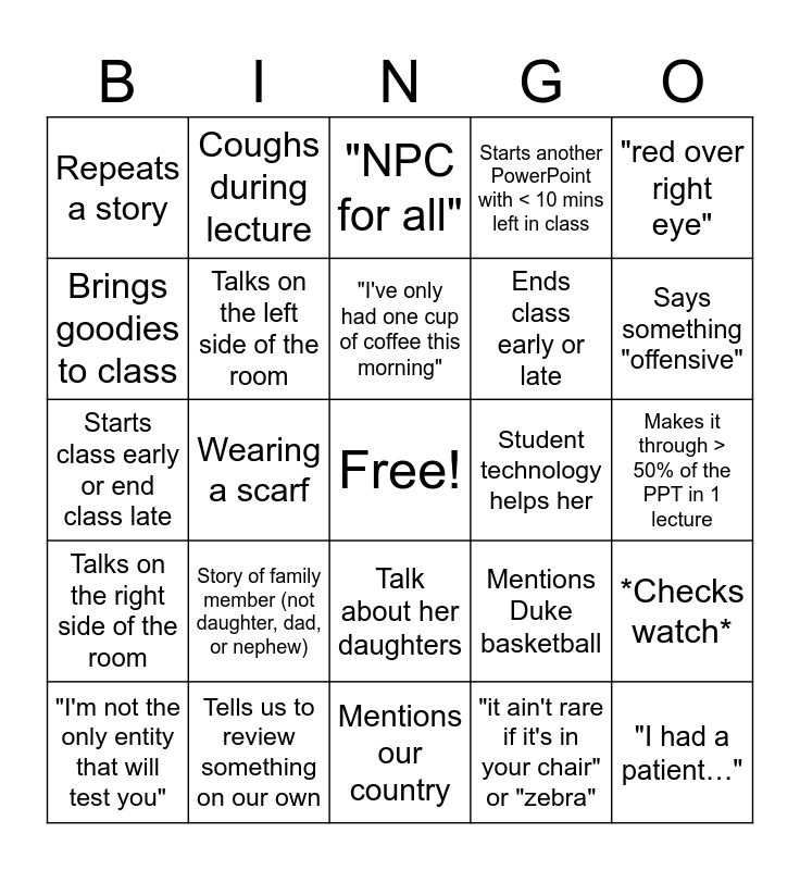 This bingo card has a free space and 32 words: "it ain't rare if it's in your chair" or "zebra", Mentions how important diet is, Wearing a scarf, Mentions her nephew Ryker, Talks on the right side of the room, Talks on the left side of the room, "red over right eye", *Checks watch*, Coughs during lecture, Mentions how NOVA taught something different than SCO, "I've only had one cup of coffee this morning", "NPC for all", Mentions research, Mentions Houston, Student technology helps her, "Hirshberg for all", "I'm not the only entity that will test you", Starts class early or end class late, Talk about her daughters, Story of family member (not daughter, dad, or nephew), Mentions Duke basketball, Story: Her correcting something, Makes it through > 50% of the PPT in 1 lecture, Tells us to review something on our own, "I had a patient…", Starts another PowerPoint with < 10 mins left in class, Ends class early or late, Brings goodies to class, Repeats a story, Mentions our country, Mispronounces a word and Says something "offensive".