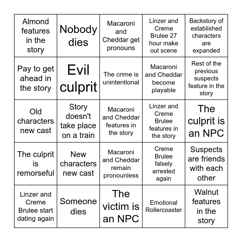 This bingo card has a free space and 24 words: New characters new cast, Someone dies, The crime is unintentional, Linzer and Creme Brulee start dating again, Backstory of established characters are expanded, Almond features in the story, Pay to get ahead in the story, Nobody dies, Linzer and Creme Brulee features in the story, Macaroni and Cheddar remain pronounless, Macaroni and Cheddar become playable, Old characters new cast, Creme Brulee falsely arrested again, Suspects are friends with each other, Evil culprit, Emotional Rollercoaster, The culprit is an NPC, Macaroni and Cheddar get pronouns, Rest of the previous suspects feature in the story, Story doesn't take place on a train, Walnut features in the story, The culprit is remorseful, Linzer and Creme Brulee 27 hour make out scene and The victim is an NPC.