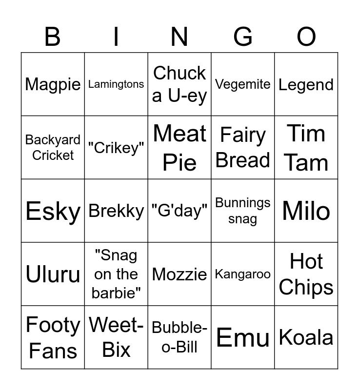 This bingo card has 25 words: "Snag on the barbie", Bubble-o-Bill, Meat Pie, Footy Fans, Legend, Magpie, Backyard Cricket, Lamingtons, Bunnings snag, Mozzie, Fairy Bread, Esky, Kangaroo, Hot Chips, "Crikey", Koala, Milo, Chuck a U-ey, Tim Tam, Brekky, "G'day", Weet-Bix, Uluru, Vegemite and Emu.