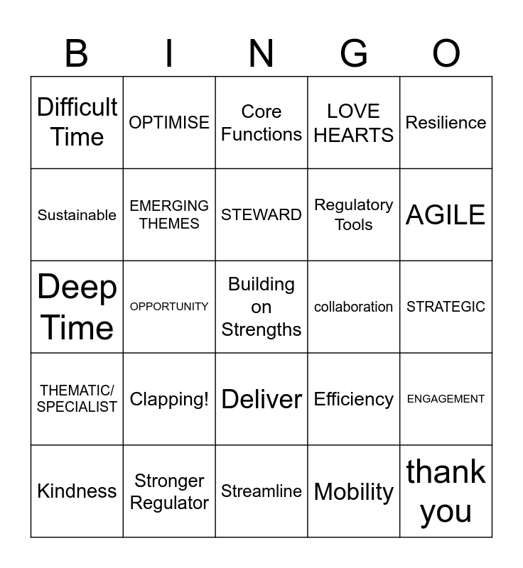 This bingo card has a free space and 24 words: Clapping!, Stronger Regulator, STEWARD, Kindness, Resilience, Difficult Time, Sustainable, OPTIMISE, collaboration, Deliver, Regulatory Tools, Deep Time, Efficiency, ENGAGEMENT, EMERGING THEMES, Mobility, STRATEGIC, Core Functions, AGILE, OPPORTUNITY, thank you, THEMATIC/ SPECIALIST, LOVE HEARTS and Streamline.