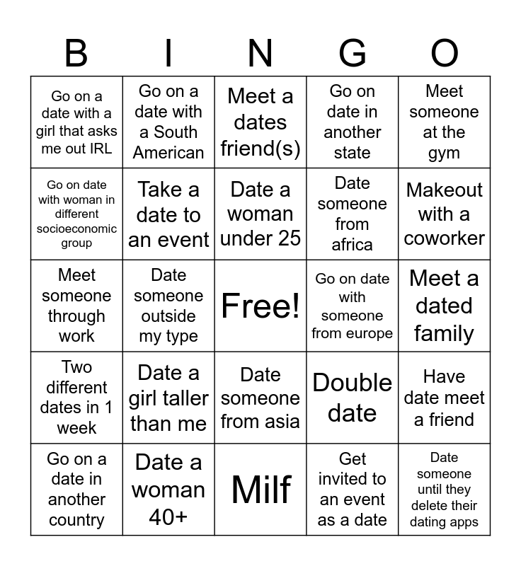 This bingo card has a free space and 24 words: Date a girl taller than me, Date a woman 40+, Date a woman under 25, Go on a date in another country, Meet someone at the gym, Go on a date with a girl that asks me out IRL, Go on date with woman in different socioeconomic group, Go on a date with a South American, Go on date with someone from europe, Date someone from asia, Date someone from africa, Meet someone through work, Double date, Have date meet a friend, Take a date to an event, Get invited to an event as a date, Meet a dated family, Meet a dates friend(s), Makeout with a coworker, Date someone outside my type, Date someone until they delete their dating apps, Two different dates in 1 week, Go on date in another state and Milf.