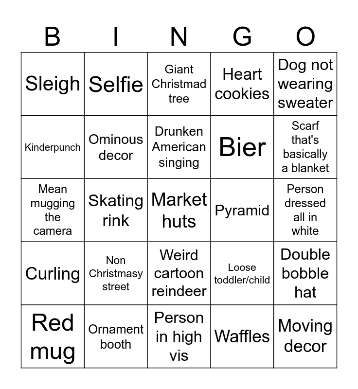 This bingo card has a free space and 35 words: Truffles, Dogs in sweaters, Creepy elf, Ominous decor, Weird cartoon reindeer, Heart cookies, Kinderpunch, Elaborate employee costumes, Drunken American singing, Santa hats, Mean mugging the camera, Dog not wearing sweater, Paper star lanterns, Christmas themed kiddie rides, Sleigh, Pyramid, Waffles, Skating rink, Curling, Moving decor, Loose toddler/child, Red mug, Double bobble hat, Ornament booth, Giant Christmad tree, Scarf that's basically a blanket, Beeswax candles, Mulled wine, Bier, Person dressed all in white, Gnomes, Person in high vis, Non Christmasy street, Selfie and Creepy santa.
