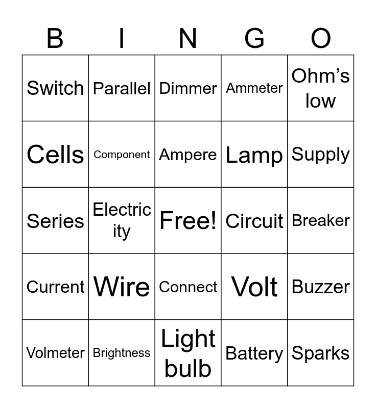 This bingo card has a free space and 24 words: Wire, Brightness, Ampere, Volmeter, Ohm’s low, Switch, Cells, Parallel, Circuit, Connect, Lamp, Series, Volt, Buzzer, Component, Battery, Breaker, Dimmer, Supply, Electric ity, Sparks, Current, Ammeter and Light bulb.