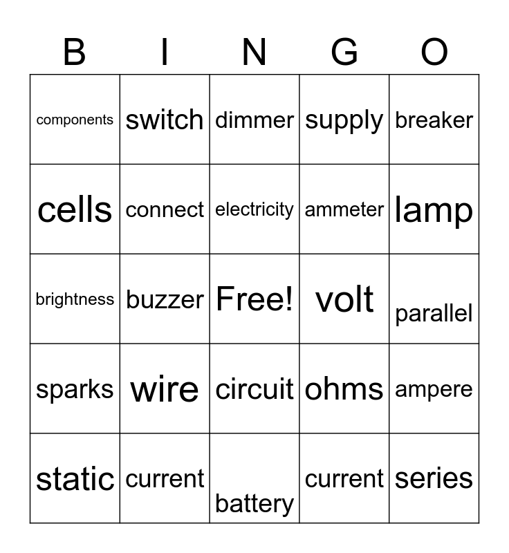 This bingo card has a free space and 24 words: wire, current, electricity, static, breaker, components, cells, switch, volt, circuit, ammeter, brightness, ohms, ampere, connect, current, parallel, dimmer, lamp, buzzer, series, sparks, supply and battery.