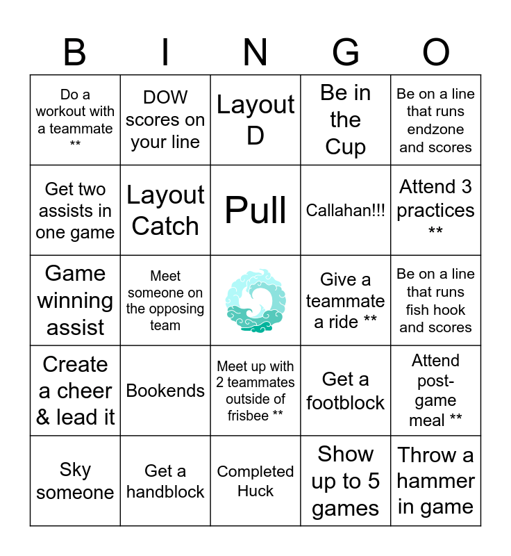 This bingo card has a free space and 28 words: Attend post-game meal **, Game winning catch, Callahan!!!, Show up to 5 games, Get two assists in one game, Layout D, DOW scores on your line, Create a cheer & lead it, Give a teammate a ride **, Sky someone, Game winning assist, Be in the Cup, Get a handblock, Completed Huck, Attend 3 practices **, Score twice in one game, Bookends, Layout Catch, Pull, Meet up with 2 teammates outside of frisbee **, Do a workout with a teammate **, Be the FIRST person to show up to a game **, Throw a hammer in game, Meet someone on the opposing team, Be on a line that runs fish hook and scores, Get a footblock, Be on a line that runs endzone and scores and Play in your opposite role for a point (handler cuts, cutter handles).
