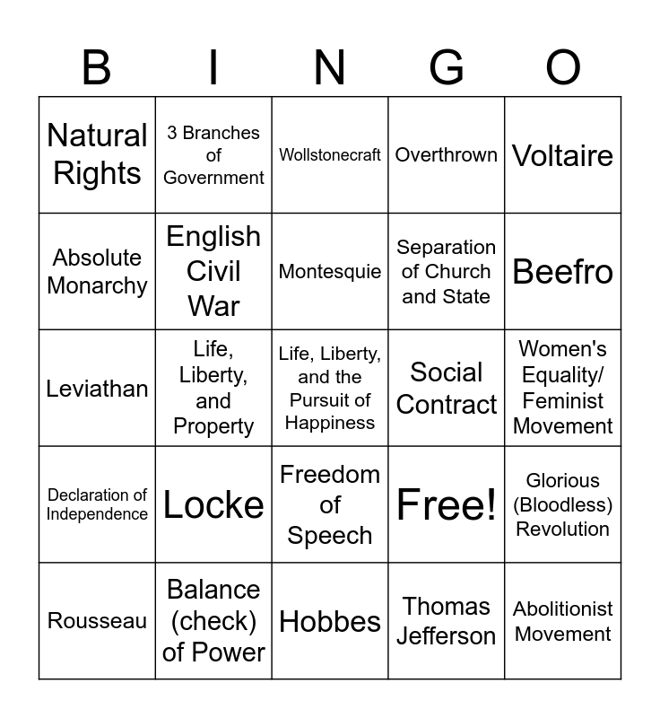 This bingo card has 25 words: Locke, Hobbes, Montesquie, Rousseau, Voltaire, Natural Rights, Absolute Monarchy, 3 Branches of Government, Social Contract, Freedom of Speech, Separation of Church and State, Leviathan, Free!, Glorious (Bloodless) Revolution, English Civil War, Abolitionist Movement, Women's Equality/ Feminist Movement, Wollstonecraft, Beefro, Life, Liberty, and Property, Life, Liberty, and the Pursuit of Happiness, Balance (check) of Power, Declaration of Independence, Overthrown and Thomas Jefferson.