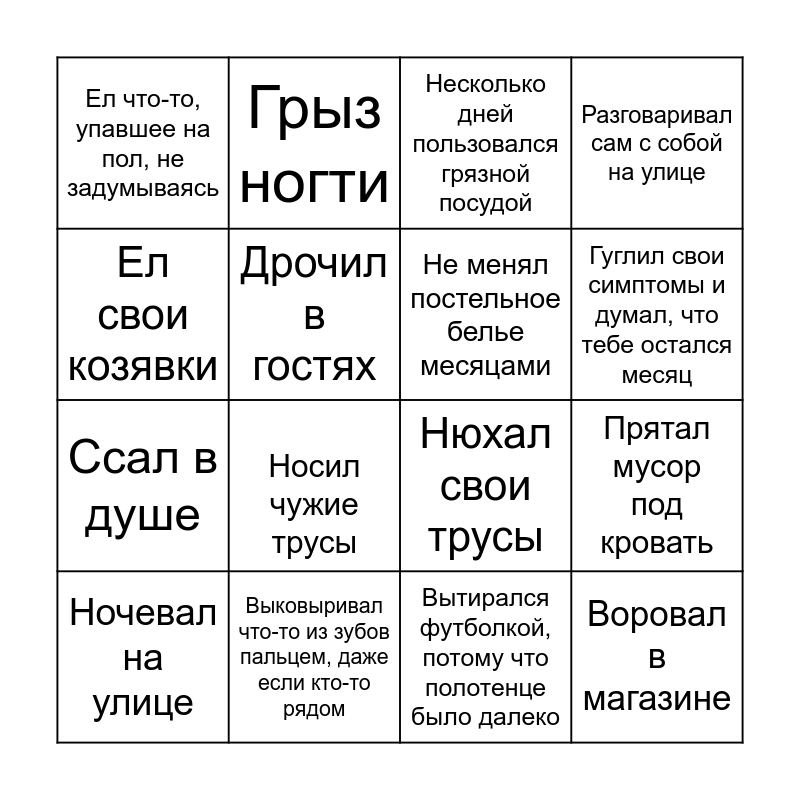 This bingo card has 16 words: Выковыривал что-то из зубов пальцем, даже если кто-то рядом, Прятал мусор под кровать, Несколько дней пользовался грязной посудой, Ел что-то, упавшее на пол, не задумываясь, Ссал в душе, Грыз ногти, Нюхал свои трусы, Вытирался футболкой, потому что полотенце было далеко, Ел свои козявки, Дрочил в гостях, Ночевал на улице, Разговаривал сам с собой на улице, Носил чужие трусы, Гуглил свои симптомы и думал, что тебе остался месяц, Не менял постельное белье месяцами and Воровал в магазине.