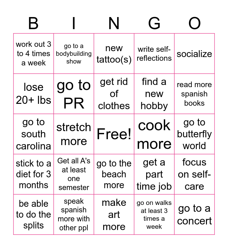 This bingo card has a free space and 24 words: Get all A's at least one semester, speak spanish more with other ppl, get rid of clothes, be able to do the splits, socialize, work out 3 to 4 times a week, lose 20+ lbs, go to a bodybuilding show, cook more, go to the beach more, find a new hobby, go to south carolina, get a part time job, focus on self-care, go to PR, go on walks at least 3 times a week, go to butterfly world, new tattoo(s), read more spanish books, stretch more, go to a concert, stick to a diet for 3 months, write self-reflections and make art more.
