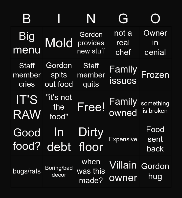 This bingo card has a free space and 24 words: In debt, Boring/bad decor, Staff member quits, bugs/rats, Owner in denial, Big menu, Staff member cries, Mold, Family owned, Dirty floor, Family issues, IT’S RAW, Expensive, Food sent back, Gordon spits out food, Villain owner, something is broken, Gordon provides new stuff, Frozen, "it's not the food", Gordon hug, Good food?, not a real chef and when was this made?.