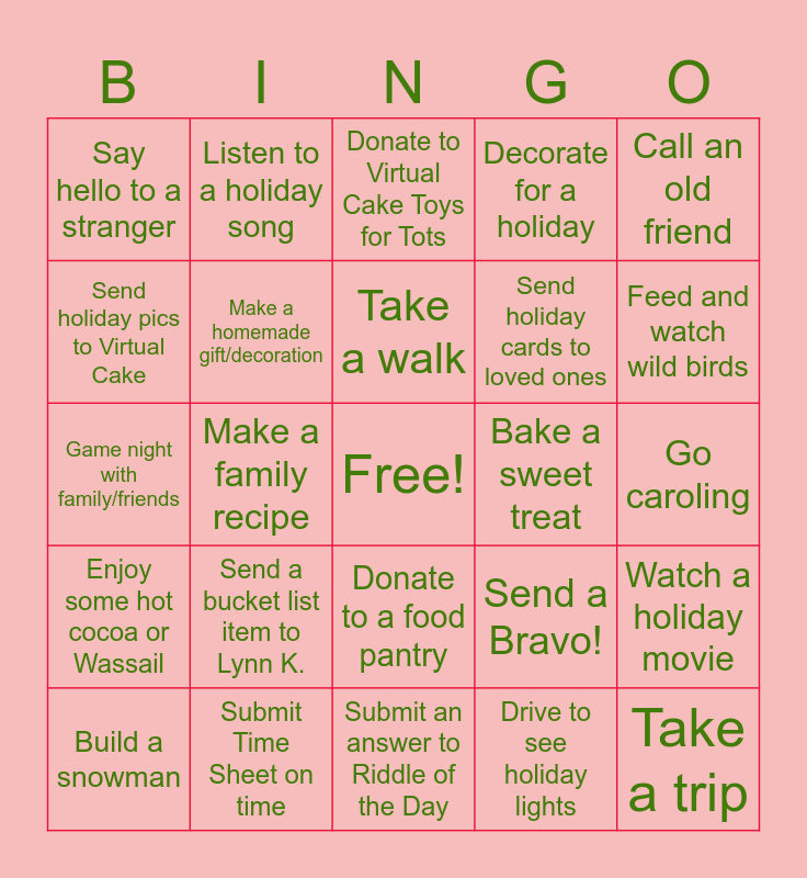 This bingo card has a free space and 24 words: Send a bucket list item to Lynn K., Submit Time Sheet on time, Take a walk, Build a snowman, Call an old friend, Say hello to a stranger, Send holiday pics to Virtual Cake, Listen to a holiday song, Bake a sweet treat, Donate to a food pantry, Send holiday cards to loved ones, Game night with family/friends, Send a Bravo!, Watch a holiday movie, Make a homemade gift/decoration, Drive to see holiday lights, Go caroling, Donate to Virtual Cake Toys for Tots, Feed and watch wild birds, Make a family recipe, Take a trip, Enjoy some hot cocoa or Wassail, Decorate for a holiday and Submit an answer to Riddle of the Day.