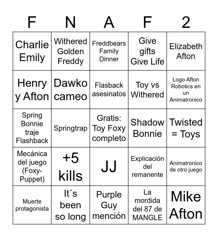This bingo card has a free space and 24 words: +5 kills, It´s been so long, Flasback asesinatos, Muerte protagonista, Elizabeth Afton, Charlie Emily, Henry y Afton, Withered Golden Freddy, Shadow Bonnie, JJ, Toy vs Withered, Spring Bonnie traje Flashback, Explicación del remanente, Animatronico de otro juego, Dawko cameo, La mordida del 87 de MANGLE, Twisted = Toys, Freddbears Family Dinner, Logo Afton Robotics en un Animatronico, Springtrap, Mike Afton, Mecánica del juego (Foxy-Puppet), Give gifts Give Life and Purple Guy mención.