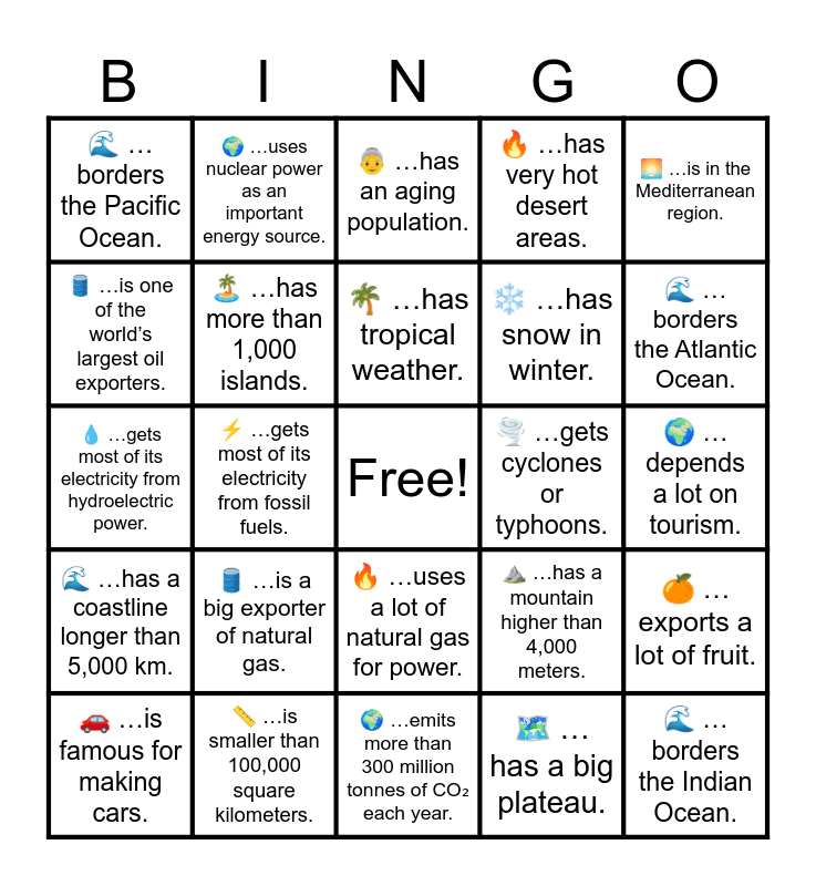 This bingo card has a free space and 58 words: 🌏 …is larger than 1,000,000 square kilometers., 📏 …is smaller than 100,000 square kilometers., 🏝️ …has many islands., 🌊 …has a coastline longer than 5,000 km., 🗺️ …has a big plateau., 🌍 …touches two different oceans., 🏝️ …has more than 1,000 islands., 🌊 …borders the Red Sea or Arabian Sea., ❄️ …has snow in winter., 🌧️ …has a rainy monsoon season., 🔥 …has very hot desert areas., 👥 …has more than 100 million people., 👤 …has fewer than 6 million people., 🌍 …has many different ethnic groups., ❤️ …has a life expectancy over 80 years., 🌊 …borders the Pacific Ocean., 🌊 …borders the Indian Ocean., 🌅 …is in the Mediterranean region., 🏜️ …has a desert., 🌴 …has tropical weather., 🌪️ …gets cyclones or typhoons., 👵 …has an aging population., 🚗 …is famous for making cars., 🍊 …exports a lot of fruit., 💡 …is known for high-tech inventions., 🌍 …depends a lot on tourism., ⛏️ …produces a lot of gold., ☕ …exports a lot of coffee., 🌊 …borders the Atlantic Ocean., 👥 …has more than 50 million people., 👶 …has fewer than 10 million people., 🗣️ …has more than one main language spoken., 🏙️ …makes most money from services., 🛢️ …exports oil or gas., 🚗 …is famous for cars and machinery., 🌍 …is famous for tourism., 🌾 …exports a lot of food or crops., ⚡ …gets most of its electricity from fossil fuels., 💧 …gets most of its electricity from hydroelectric power., ☢️ …uses a lot of nuclear power., 🛢️ …is a big exporter of natural gas., 🌫️ …produces more than 300 million tonnes of CO₂ per year., ⛰️ …has a mountain higher than 4,000 meters., 🌋 …has a famous mountain that is also a volcano., 🌲 …is mostly covered by forests., ⚛️ …uses nuclear energy for electricity., 🌱 …uses more than 50% renewable energy., 🔥 …uses a lot of natural gas for power., 🌍 …emits more than 300 million tonnes of CO₂ each year., 🌞 …is building more solar and wind farms., 🌄 …has a mountain over 2,000 meters., 🌋 …has a mountain over 3,000 meters., 🔥 …has a volcano., ⚡ …gets most of its electricity from coal., 🌍 …uses nuclear power as an important energy source., 💧 …gets more than half of its electricity from hydroelectric power., 🛢️ …is one of the world’s largest oil exporters. and 🔥 …depends a lot on imported natural gas for electricity..