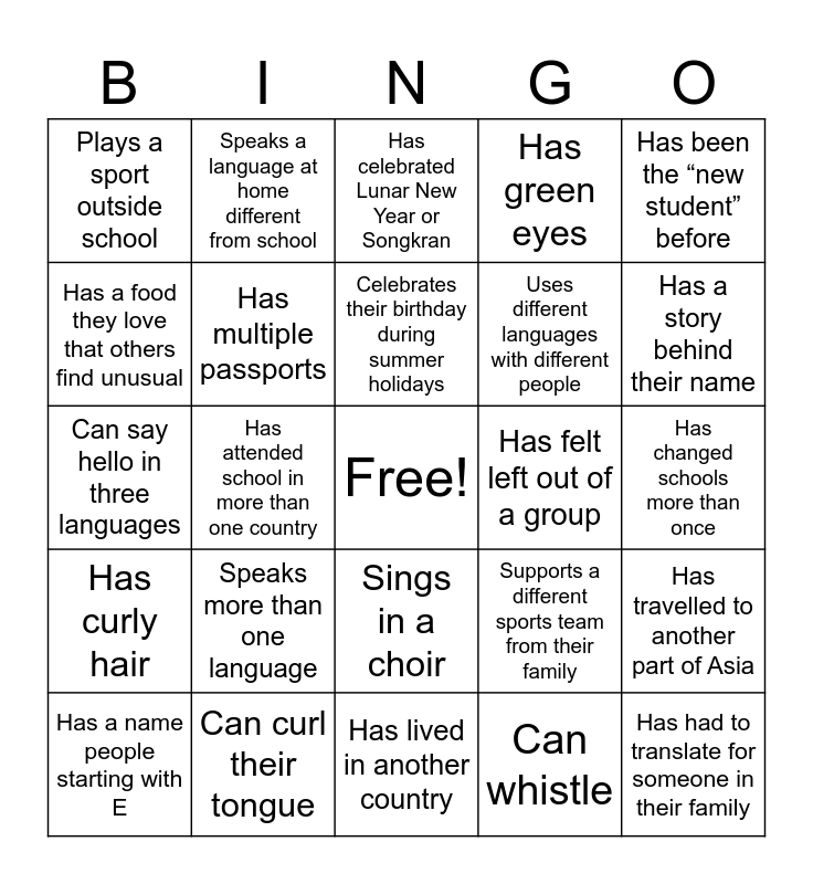 This bingo card has a free space and 25 words: Speaks more than one language, Has lived in another country, Celebrates their birthday during summer holidays, Has a name people starting with E, Has been the “new student” before, Plays a sport outside school, Has a food they love that others find unusual, Speaks a language at home different from school, Has felt left out of a group, Sings in a choir, Uses different languages with different people, Can say hello in three languages, Supports a different sports team from their family, Has travelled to another part of Asia, Has multiple passports, Moved countries after age 5, Has changed schools more than once, Has celebrated Lunar New Year or Songkran, Has a story behind their name, Has attended school in more than one country, Has had to translate for someone in their family, Can curl their tongue, Has curly hair, Has green eyes and Can whistle.