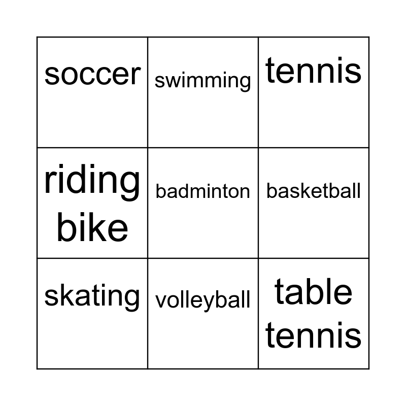 This bingo card has a free space and 8 words: basketball, tennis, swimming, skating, soccer, table tennis, riding bike and volleyball.