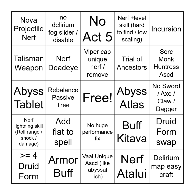 This bingo card has a free space and 24 words: Add flat to spell, Armor Buff, Viper cap unique nerf / remove, >= 4 Druid Form, Incursion, Nova Projectile Nerf, Talisman Weapon, no delirium fog slider / disable, Abyss Atlas, No huge performance fix, Trial of Ancestors, Abyss Tablet, Buff Kitava, Druid Form swap, Nerf Deadeye, Nerf Atalui, No Sword / Axe / Claw / Dagger, No Act 5, Sorc Monk Huntress Ascd, Rebalance Passive Tree, Delirium map easy craft, Nerf lightning skill (Roll range / shock / damage), Nerf +level skill (hard to find / low scaling) and Vaal Unique Ascd (like abyssal lich).