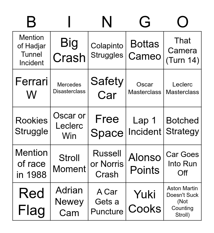 This bingo card has a free space and 24 words: Stroll Moment, Adrian Newey Cam, Safety Car, Red Flag, That Camera (Turn 14), Mention of Hadjar Tunnel Incident, Ferrari W, Big Crash, Lap 1 Incident, Russell or Norris Crash, Oscar Masterclass, Rookies Struggle, Alonso Points, Car Goes Into Run Off, Mercedes Disasterclass, Yuki Cooks, Botched Strategy, Colapinto Struggles, Leclerc Masterclass, Oscar or Leclerc Win, Aston Martin Doesn't Suck (Not Counting Stroll), Mention of race in 1988, Bottas Cameo and A Car Gets a Puncture.