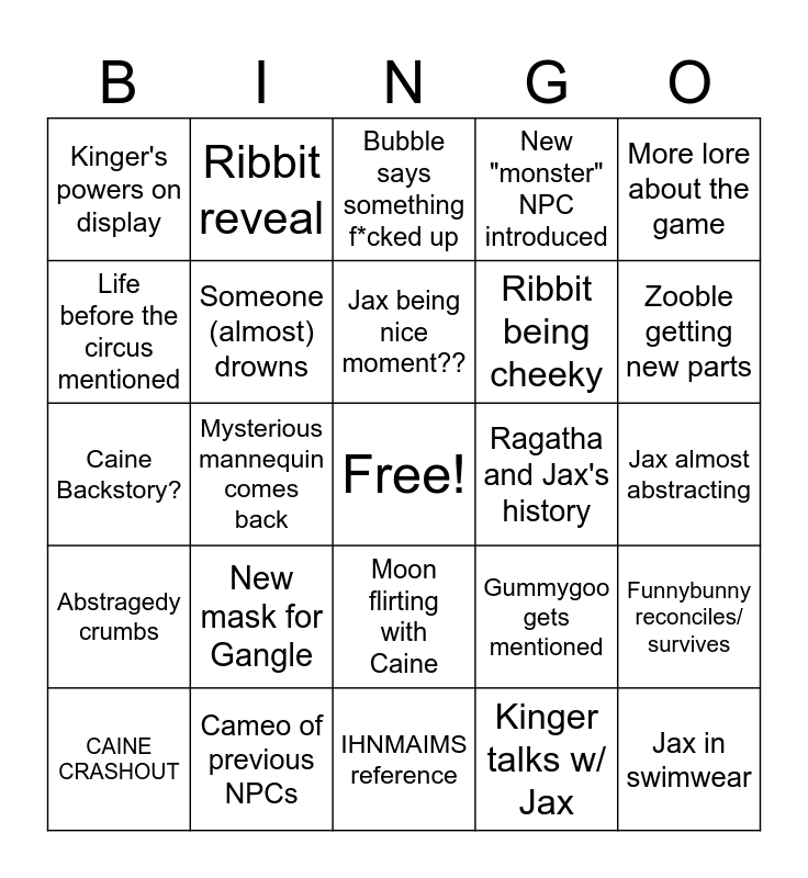 This bingo card has a free space and 24 words: New mask for Gangle, Cameo of previous NPCs, Jax being nice moment??, CAINE CRASHOUT, More lore about the game, Kinger's powers on display, Life before the circus mentioned, Ribbit reveal, Ragatha and Jax's history, Moon flirting with Caine, Ribbit being cheeky, Caine Backstory?, Gummygoo gets mentioned, Funnybunny reconciles/ survives, Someone (almost) drowns, Kinger talks w/ Jax, Jax almost abstracting, Bubble says something f*cked up, Zooble getting new parts, Mysterious mannequin comes back, Jax in swimwear, Abstragedy crumbs, New "monster" NPC introduced and IHNMAIMS reference.