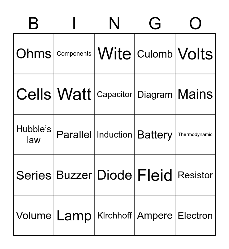 This bingo card has a free space and 24 words: Buzzer, Lamp, Capacitor, Volume, Volts, Ohms, Cells, Components, Battery, Diode, Diagram, Hubble’s law, Fleid, Resistor, Watt, Ampere, Thermodynamic, Wite, Mains, Parallel, Electron, Series, Culomb and Klrchhoff.