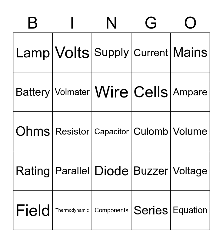 This bingo card has a free space and 24 words: Parallel, Thermodynamic, Wire, Field, Mains, Lamp, Battery, Volts, Culomb, Diode, Cells, Ohms, Buzzer, Voltage, Volmater, Series, Volume, Supply, Ampare, Resistor, Equation, Rating, Current and Components.