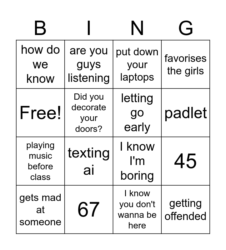 This bingo card has 16 words: 67, 45, put down your laptops, how do we know, playing music before class, are you guys listening, I know I'm boring, I know you don't wanna be here, Free!, Did you decorate your doors?, gets mad at someone, favorises the girls, texting ai, padlet, letting go early and getting offended.