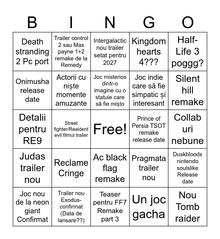 This bingo card has a free space and 24 words: Reclame Cringe, Trailer nou Exodus-confirmat (Data de lansare??), Joc misterios dintr-o imagine cu o statuie care să fie mișto, Joc nou de la neon giant Confirmat, Half-Life 3 poggg?, Death stranding 2 Pc port, Onimusha release date, Trailer control 2 sau Max payne 1+2 remake de la Remedy, Prince of Persia TSOT remake release date, Ac black flag remake, Joc indie care să fie simpatic și interesant, Detalii pentru RE9, Pragmata trailer nou, Duskbloods nintendo soulslike Release date, Actorii cu niște momente amuzante, Un joc gacha, Collab uri nebune, Intergalactic nou trailer setat pentru 2027, Silent hill remake, Street fighter/Reaident evil filmul trailer, Nou Tomb raider, Judas trailer nou, Kingdom hearts 4??? and Teaser pentru FF7 Remake part 3.
