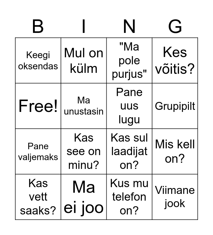 This bingo card has 16 words: Ma ei joo, Mis kell on?, "Ma pole purjus", Keegi oksendas, Pane valjemaks, Mul on külm, Kas sul laadijat on?, Kus mu telefon on?, Free!, Ma unustasin, Kas vett saaks?, Kes võitis?, Kas see on minu?, Grupipilt, Pane uus lugu and Viimane jook.