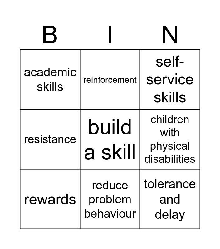 This bingo card has a free space and 8 words: children with physical disabilities, self-service skills, reinforcement, rewards, academic skills, tolerance and delay, resistance and reduce problem behaviour.