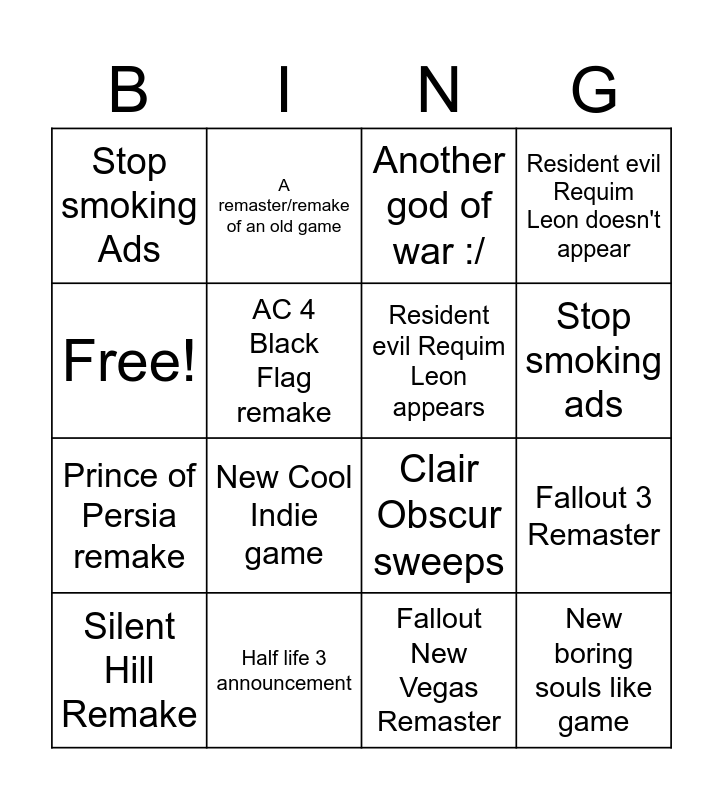 This bingo card has 16 words: Half life 3 announcement, Fallout 3 Remaster, Another god of war :/, Stop smoking Ads, Prince of Persia remake, A remaster/remake of an old game, Clair Obscur sweeps, Fallout New Vegas Remaster, Free!, AC 4 Black Flag remake, Silent Hill Remake, Resident evil Requim Leon doesn't appear, New Cool Indie game, Stop smoking ads, Resident evil Requim Leon appears and New boring souls like game.