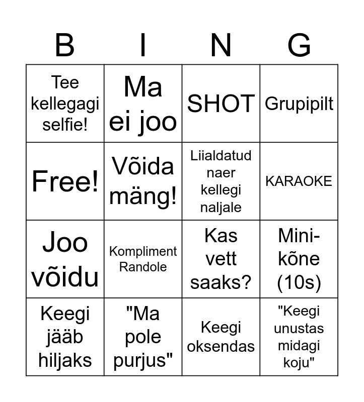 This bingo card has 16 words: "Ma pole purjus", Mini-kõne (10s), SHOT, Tee kellegagi selfie!, Joo võidu, Ma ei joo, Kas vett saaks?, Keegi oksendas, Free!, Võida mäng!, Keegi jääb hiljaks, Grupipilt, Kompliment Randole, KARAOKE, Liialdatud naer kellegi naljale and "Keegi unustas midagi koju".
