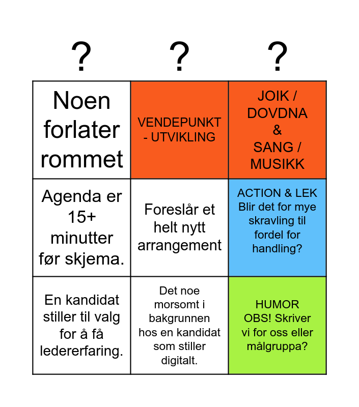 This bingo card has 28 words: MÅLGRUPPA tenk som en treåring: er dette gøy, FOKUS I EPISODEN (I EN SETNING): Hva vil vi at treåringen skal lære/sitte igjen med?, HUMOR OBS! Skriver vi for oss eller målgruppa?, KULTUR OG STOLTHET, ACTION & LEK Blir det for mye skravling til fordel for handling?, JOIK / DOVDNA & SANG / MUSIKK, VENDEPUNKT - UTVIKLING, REALITETS-ORIENTERING, "MOUNT EVEREST"-EPISODE, Maten blir kald fordi en sak tar lengre tid enn planlagt., Noen stiller til valg som eneste kandidat., Agenda er 15+ minutter før skjema., “Hvor mange enheter kan du drikke på en kveld?”, En kandidat sier de ønsker å forbedre TIHLDE., Noen snakker om drikke- preferansene sine., Noen spør hva TIHLDE står for., En sak blir nedstemt., En kandidat stiller til valg for å få ledererfaring., Det noe morsomt i bakgrunnen hos en kandidat som stiller digitalt., Brage ler så høyt at hele salen hører det, Noen forlater rommet, “Stem på meg”, Har ikke forberedt en åpningsappel, Nevner at han/hun har en ferdighet som er helt irrelevant for vervet, Har ledererfaring, Snakker om studiemiljø, Foreslår et helt nytt arrangement and l.
