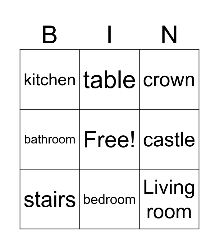 This bingo card has a free space and 8 words: castle, crown, table, stairs, kitchen, Living room, bathroom and bedroom.