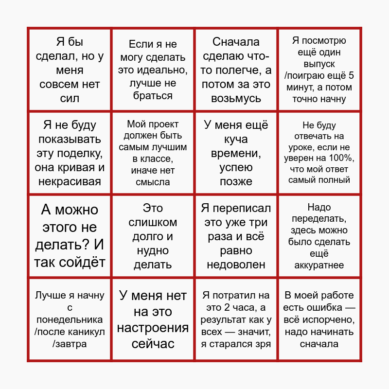 This bingo card has 16 words: У меня нет на это настроения сейчас, Надо переделать, здесь можно было сделать ещё аккуратнее, Сначала сделаю что-то полегче, а потом за это возьмусь, Я бы сделал, но у меня совсем нет сил, А можно этого не делать? И так сойдёт, Если я не могу сделать это идеально, лучше не браться, Я переписал это уже три раза и всё равно недоволен, Я потратил на это 2 часа, а результат как у всех — значит, я старался зря, Я не буду показывать эту поделку, она кривая и некрасивая, Мой проект должен быть самым лучшим в классе, иначе нет смысла, Лучше я начну с понедельника /после каникул /завтра, Я посмотрю ещё один выпуск /поиграю ещё 5 минут, а потом точно начну, Это слишком долго и нудно делать, Не буду отвечать на уроке, если не уверен на 100%, что мой ответ самый полный, У меня ещё куча времени, успею позже and В моей работе есть ошибка — всё испорчено, надо начинать сначала.